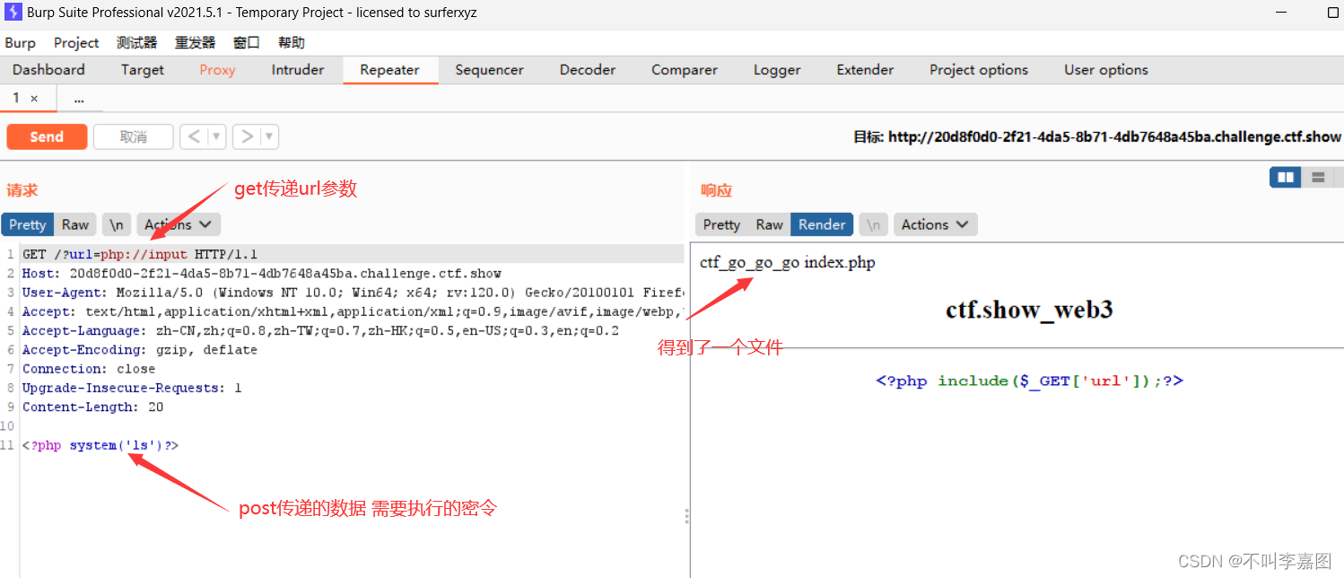 使用 php://input:可以访问请求的原始数据的只读流,将post请求的数据当作php代码执行,当传入的参数作为文件名打开时,可以将参数设为php://input,同时post写入想要执行的php代码,php执行时会将post内容当作文件内容,从而导致任意代码执行。