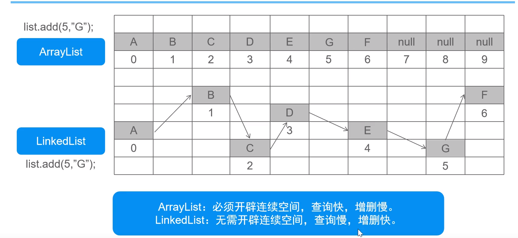 private static class Node<E> { E item;//当前元素 LinkedList.Node<E> next;//下一个元素 LinkedList.Node<E> prev;//上个元素 Node(LinkedList.Node<E> prev, E element, LinkedList.Node<E> next) { this.item = element; this.next = next; this.prev = prev; } }ArrayList和LinkedList比较