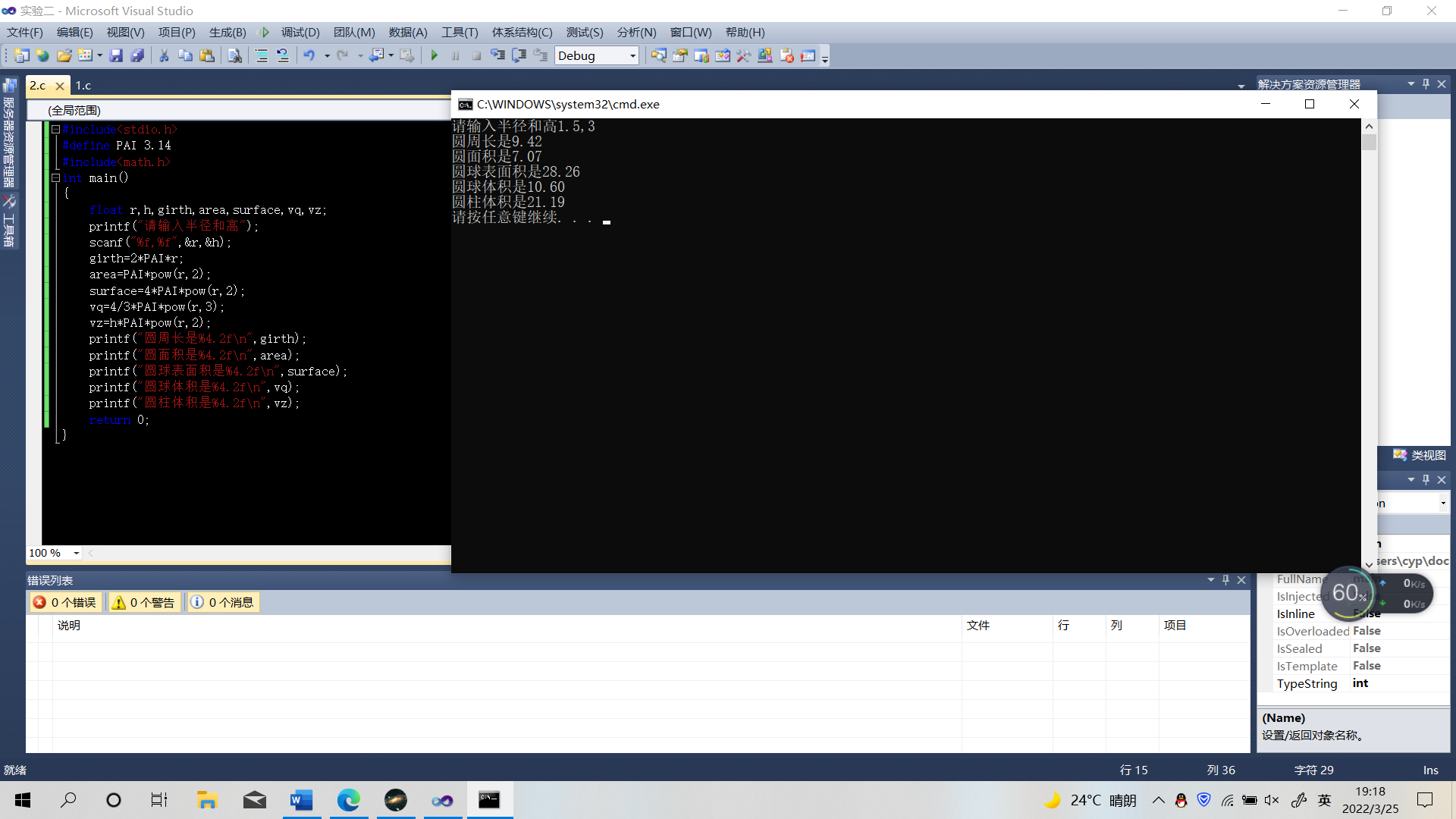 7.设圆半径r=1.5,圆柱高h=3,求圆周长、圆面积、圆球表面积、圆球体积、圆柱体积。用scanf输人数据,输出计算结果,输出时要求有文字说明,取小数点后2位数字2编程序。