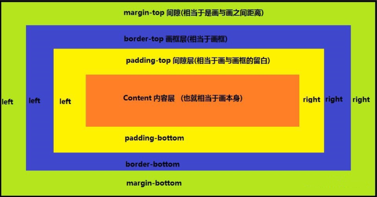 盒子模型是由:内容(Content)、边框(Border)、间隙(padding)、外间隔(margin)组成,为了便于理解可以把盒子模型想象成一幅画,content是画本身,padding是画与画框的留白,border是画框,margin是画与画之间距离,他们的关系如下图所示: