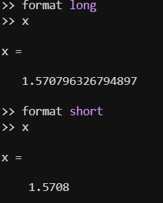 在命令行窗口中仅显示前四个小数位。您可以使用 format 函数控制显示的精度。