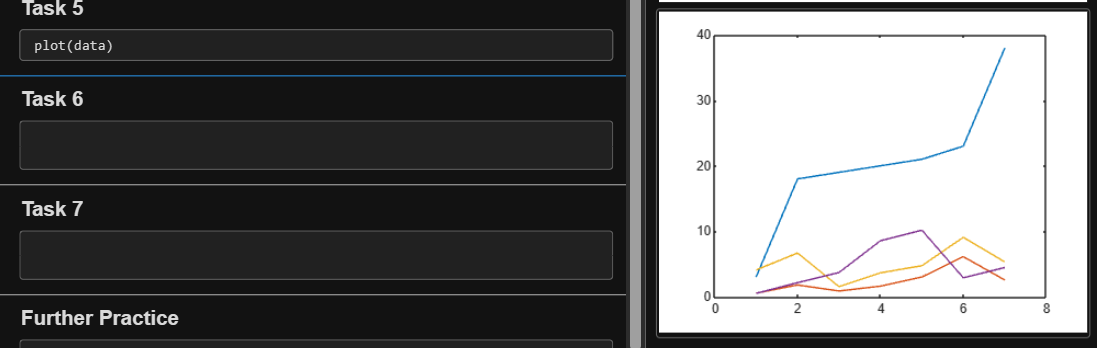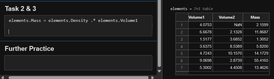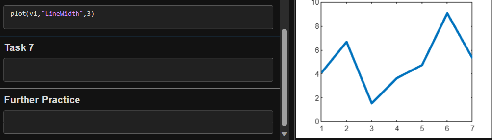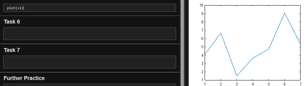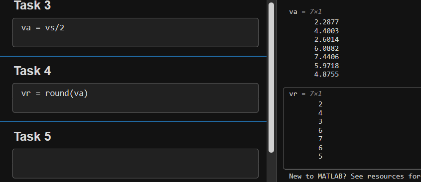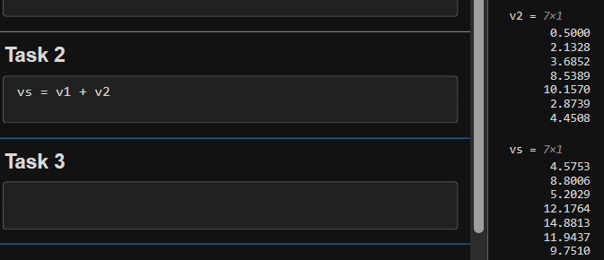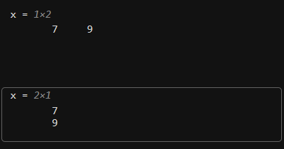 当您用空格(或逗号)分隔数值时(如前面的任务中所示),MATLAB 会(默认)将这些数值组合为一个行向量,行向量是一个包含一行多列的数组 (1×n)。