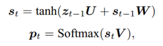 其中 U,W,V 是可学习的参数。U,W 负责维护循环状态,而 V 负责将当前时刻状态转换到词表大小的概率分布 :