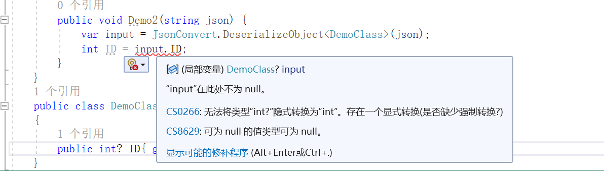 在日常开发中,我们经常遇到可空类型赋值给另一个变量,会提示我们无法将Int?隐式转换为int,如图所示