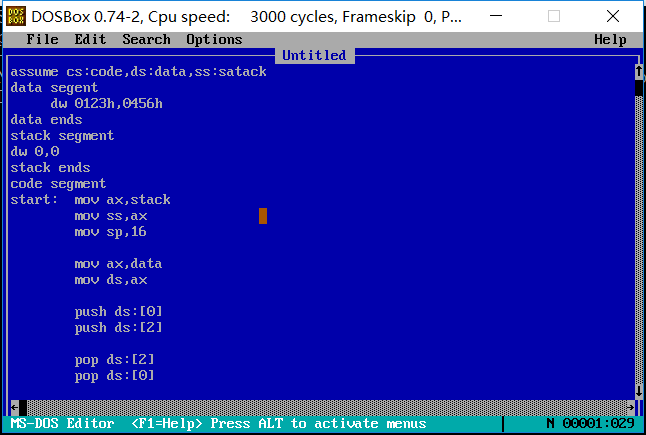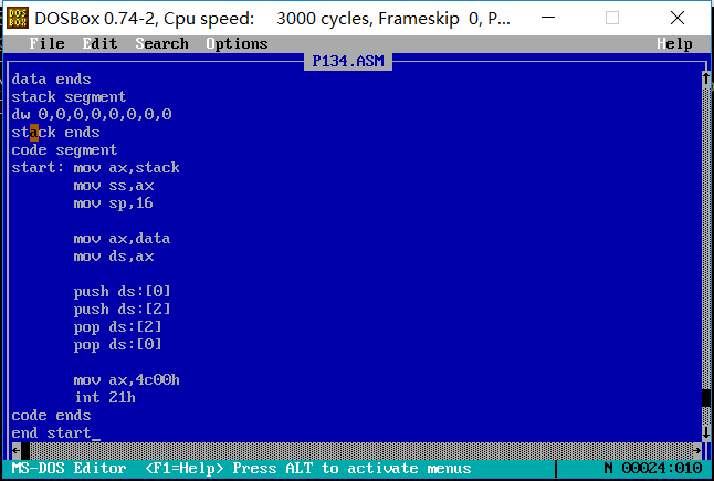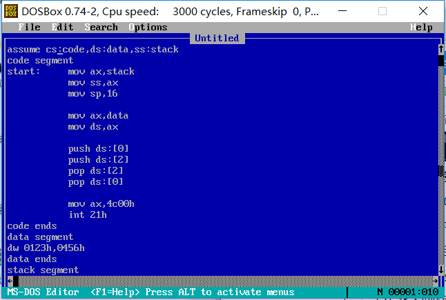 ③设程序加载后,code段的段地址为X,则data段的段地址为 X-2 、stack段的段地址为 X-1 。