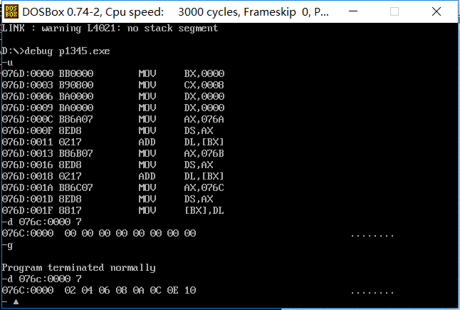 ②CPU执行程序,程序返回前,cs= 076ch 、ss= 076bh 、ds= 076ah 。