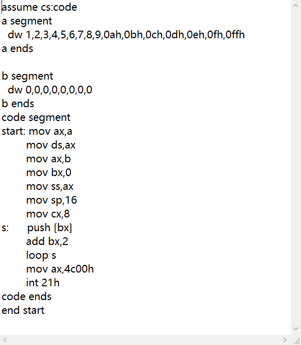 (6)程序如下,编写code段中的代码,用push指令将a段中的前8个字型数据,逆序存储到b段中