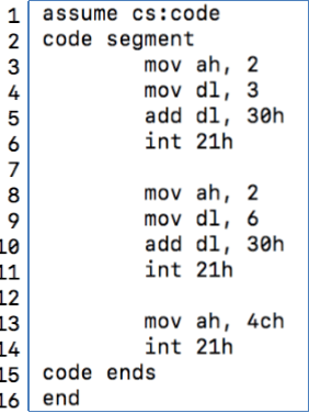 (2) 将 line4和line9种寄存器dl 的值分别修改为 0~9 中任何一个数字,重新汇编→ 连接→运行,观察结果的变化。
