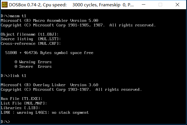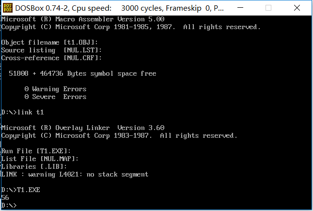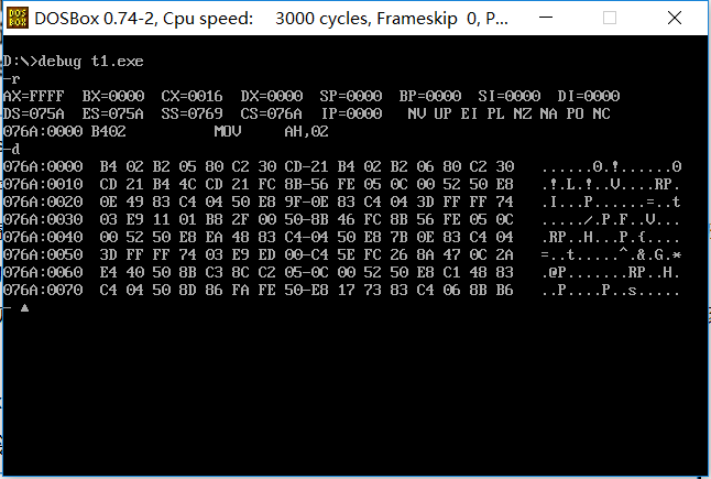 第2步,对源程序 t1.asm 进行汇编、连接、运行、调试