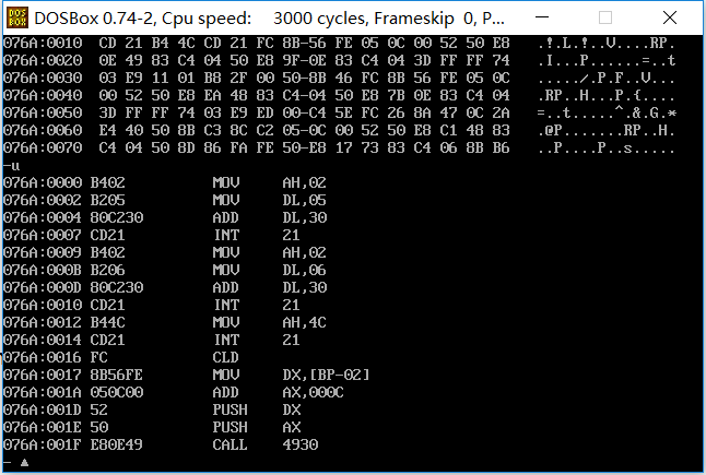 ③ 使用 u 命令对 t1.exe 进行反汇编,观察反汇编得到的源代码。