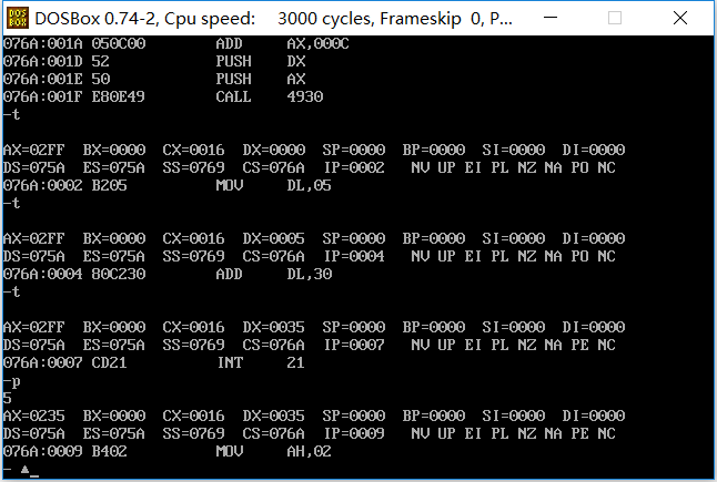 ④ 使用 t 命令和 p 命令(遇到 int 命令时,用 p 命令)单步调试,观察结果