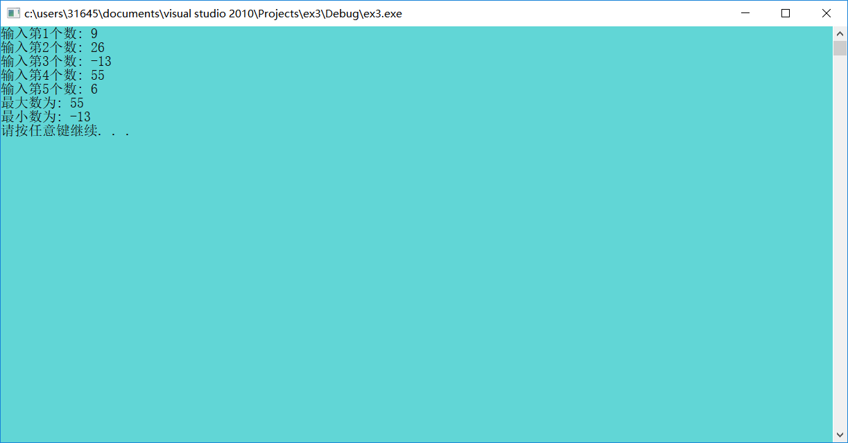 /* 编程找出5个整数的最大数和最小数 《C语言程序设计教程学习指导》p122实验内容(3) */ #include <stdio.h> #include <stdlib.h> int main() { int number, max, min, n; n=1; printf("输入第%d个数: ", n); scanf("%d", &number); max = number; min = number; do{ n++; printf("输入第%d个数: ", n); scanf("%d", &number); if(number>max) max = number; else if(number<min) min = number; } while( n<5 ); printf("最大数为: %d\n", max); printf("最小数为: %d\n", min); getchar (); system("pause"); return 0; }