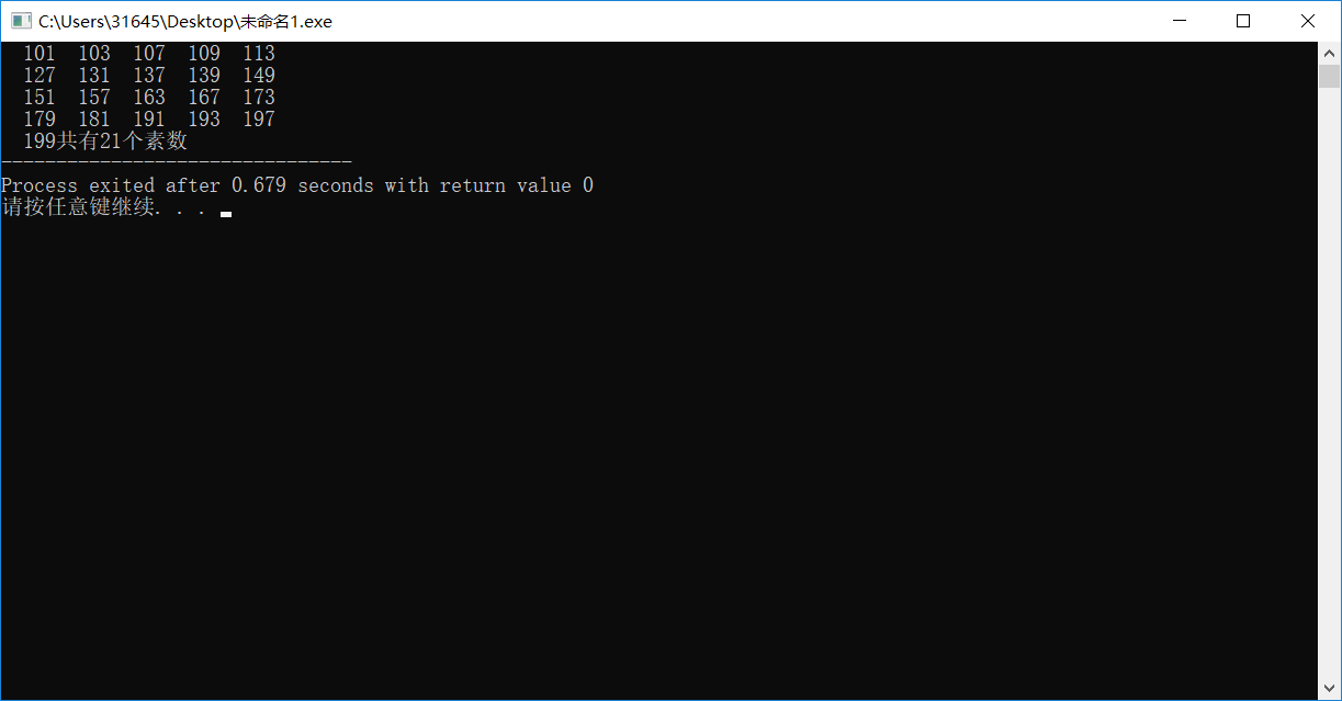 #include <stdio.h> #include <math.h> int main() { int n,m,i,k; k = 0; for(n=101;n<=200;n++) { m=sqrt(n); for(i=2;i<=m;i++) if(n%i==0) break; if(i>m) { printf("%5d",n); k++; if(k%5==0) printf("\n"); } } printf("共有%d个素数",k); return 0; }