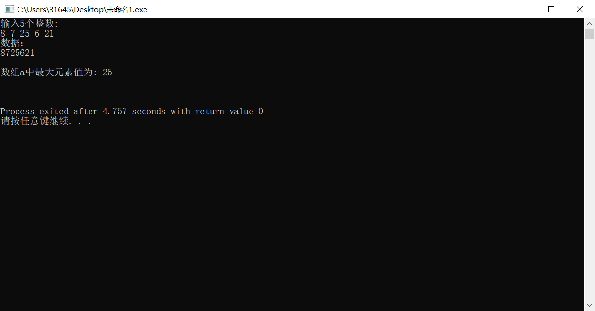 // 功能描述:输入一组整数,输出最大值 #include <stdio.h> int findMax(int x[], int n); // 函数声明 const int N=5; int main() { int a[N]; int max, i; printf("输入%d个整数: \n", N); // 利用循环输入N个整数给数组a // 补足程序1 // 。。。 for(i=0;i<N;i++) scanf("%d",&a[i]); printf("数据:\n"); for(i=0;i<N;i++) printf("%d",a[i]); printf("\n"); // 调用子函数max求数组a的最大元素值,并赋值给max // 补足程序2 // 。。。 findMax(a,N); max = findMax(a,N); printf("\n") ; // 输出最大值 printf("数组a中最大元素值为: %d\n\n", max); return 0; } // 函数定义 // 功能描述:找出整型数组a中元素的最大值,并返回次此最大值 // 补足函数findMax()的实现部分3 // 。。。 int findMax(int a[],int n) { int i,max; max=a[0]; for(i=0;i<N;i++) { if(a[i]>max) max=a[i]; } return max; }