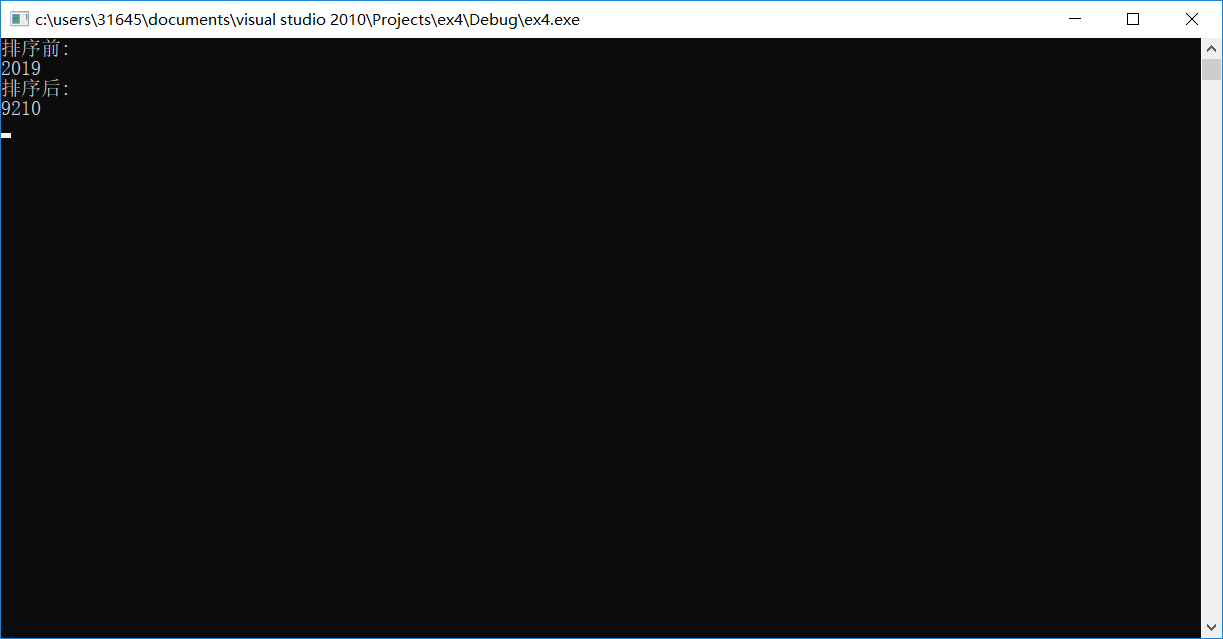#include <stdio.h> const int N=4; void output(char x[], int n); // 函数声明 // 排序函数声明 void bubbleSort(char x[],int n); int main() { char string[N] = {'2','0','1','9'}; int i; printf("排序前: \n"); output(string, N); // 调用排序函数对字符数组中的字符由大到小排序 bubbleSort(string,N); printf("\n排序后: \n"); output(string, N); printf("\n"); getchar(); return 0; } // 函数定义 // 函数功能描述:输出包含有n个元素的字符数组元素 // 形参:字符数组,以及字符数组元素个数 void output(char x[], int n) { int i; for(i=0; i<N; i++) printf("%c", x[i]); } // 函数定义 // 函数功能描述:对一组字符由大到小排序 // 形参:字符数组,以及字符数组元素个数 // 补足代码3 void bubbleSort(char x[],int n){ int i,j; char t; for(i=0;i<n-1;i++){ for(j=0;j<n-1-i;j++){ if(x[j]<x[j+1]){ t=x[j]; x[j]=x[j+1]; x[j+1]=t; } } } }