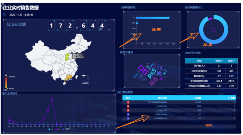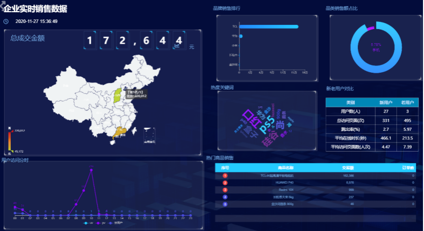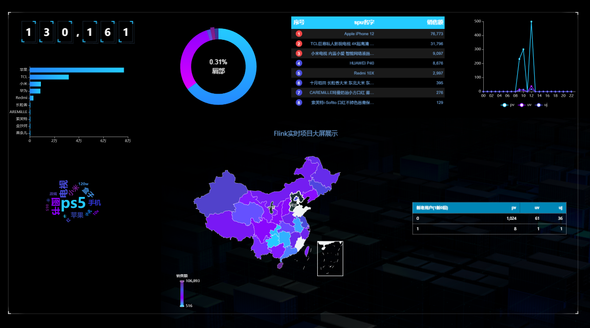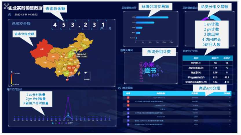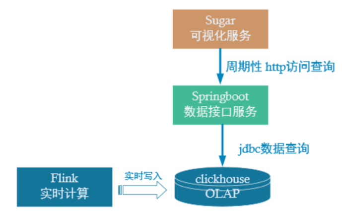之前数据分层处理,最后把轻度聚合的结果保存到ClickHouse中,主要的目的就是提供即时的数据查询、统计、分析服务。这些统计服务一般会用两种形式展现,一种是为专业的数据分析人员的BI工具,一种是面向非专业人员的更加直观的数据大屏。