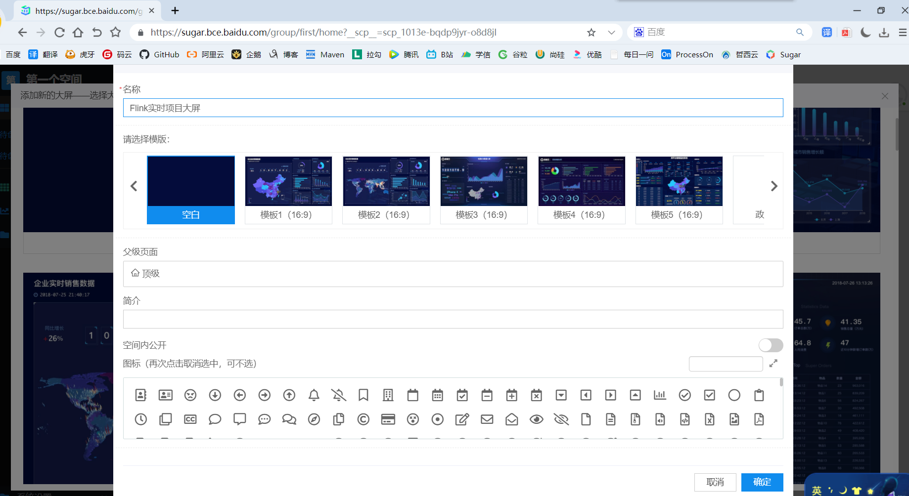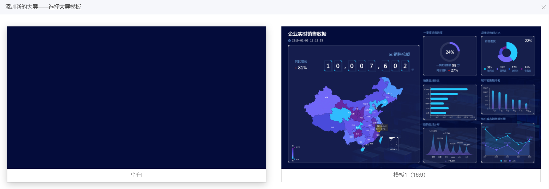 7)选择空模板或者根据现有模板进行修改,我们这里选择空白模板,并指定大屏的名称