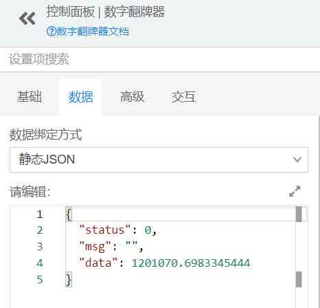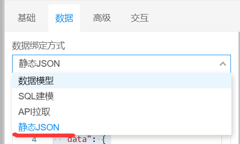 在数据绑定的位置选择【静态JSON】,可以看到数据需要的JSON格式