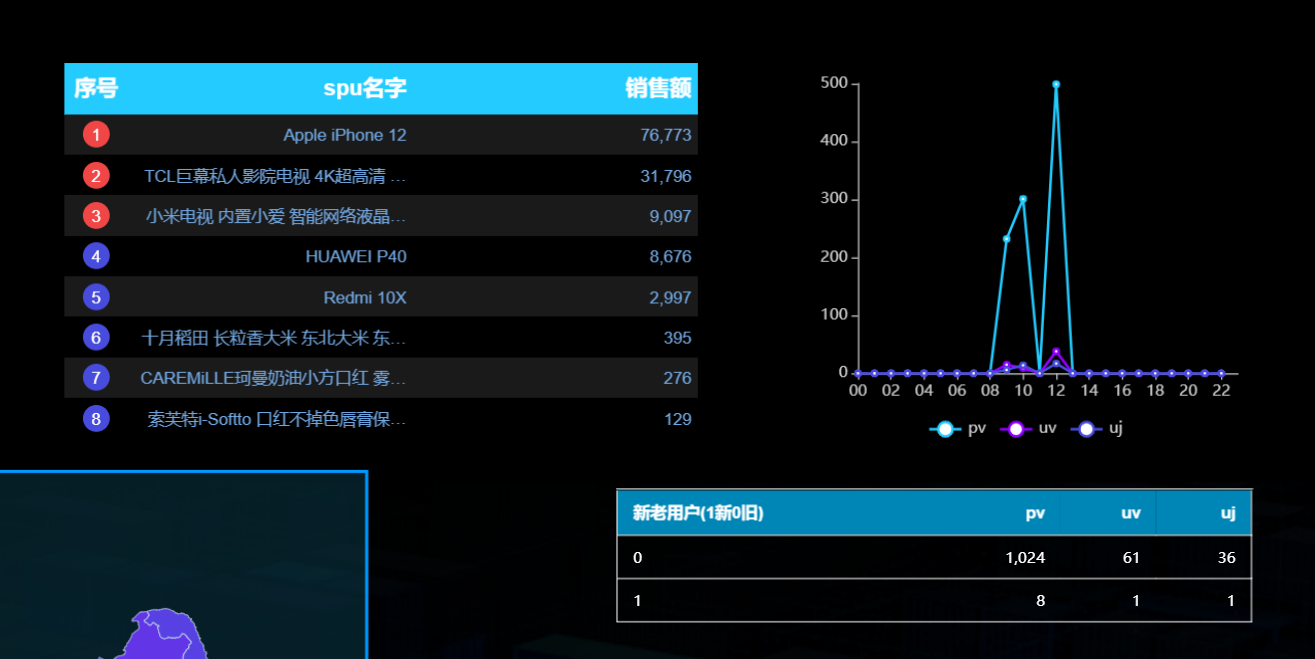 @Autowired VisitorService visitorService; @RequestMapping("/sugar/api/visitor/hour") public String visitorByHour(@RequestParam(value = "date",defaultValue = "0")int date){ if (date == 0){ date = Integer.parseInt(new SimpleDateFormat("yyyyMMdd").format(new Date())); } List<VisitorStats> list = visitorService.statsByHour(date); HashMap<Integer, VisitorStats> hourToVS = new HashMap<>(); for (VisitorStats visitorStats : list) { hourToVS.put(Integer.parseInt(visitorStats.getHour()),visitorStats); } JSONObject result = new JSONObject(); result.put("status", 0); result.put("msg", ""); JSONObject data = new JSONObject(); JSONArray categories = new JSONArray(); for (int i = 0; i < 24; i++) { // 00 01 02 03 ... 12 13 14 categories.add(new DecimalFormat("00").format(i)); } data.put("categories",categories); JSONArray series = new JSONArray(); JSONObject pv = new JSONObject(); pv.put("name","pv"); JSONArray pvData = new JSONArray(); for (int i = 0; i < 23; i++) { VisitorStats vs = hourToVS.get(i); if (vs != null) { pvData.add(vs.getPv_ct()); } else { pvData.add(0); } } pv.put("data",pvData); series.add(pv); JSONObject uv = new JSONObject(); uv.put("name", "uv"); JSONArray uvData = new JSONArray(); for (int i = 0; i < 23; i++) { VisitorStats vs = hourToVS.get(i); if (vs != null) { uvData.add(vs.getUv_ct()); } else { uvData.add(0); } } uv.put("data", uvData); series.add(uv); JSONObject uj = new JSONObject(); uj.put("name", "uj"); JSONArray ujData = new JSONArray(); for (int i = 0; i < 23; i++) { VisitorStats vs = hourToVS.get(i); if (vs != null) { ujData.add(vs.getUj_ct()); } else { ujData.add(0); } } uj.put("data", ujData); series.add(uj); data.put("series",series); result.put("data",data); return result.toJSONString(); } @RequestMapping("/sugar/api/visitor/isnew") public String visitorByIsNew(@RequestParam(value = "date", defaultValue = "0") int date){ if (date == 0){ date = Integer.parseInt(new SimpleDateFormat("yyyyMMdd").format(new Date())); } List<VisitorStats> list = visitorService.statsByIsNew(date); JSONObject result = new JSONObject(); result.put("status", 0); result.put("msg", ""); JSONObject data = new JSONObject(); data.put("total",list.size()); JSONArray columns = new JSONArray(); JSONObject c1 = new JSONObject(); c1.put("name", "新老用户(1新0旧)"); c1.put("id", "is_new"); columns.add(c1); JSONObject c2 = new JSONObject(); c2.put("name", "pv"); c2.put("id", "pv"); columns.add(c2); JSONObject c3 = new JSONObject(); c3.put("name", "uv"); c3.put("id", "uv"); columns.add(c3); JSONObject c4 = new JSONObject(); c4.put("name", "uj"); c4.put("id", "uj"); columns.add(c4); data.put("columns",columns); JSONArray rows = new JSONArray(); for (VisitorStats vs : list) { JSONObject row = new JSONObject(); row.put("is_new", vs.getIs_new()); row.put("pv", vs.getPv_ct()); row.put("uv", vs.getUv_ct()); row.put("uj", vs.getUj_ct()); rows.add(row); } data.put("rows",rows); result.put("data",data); return result.toJSONString(); }