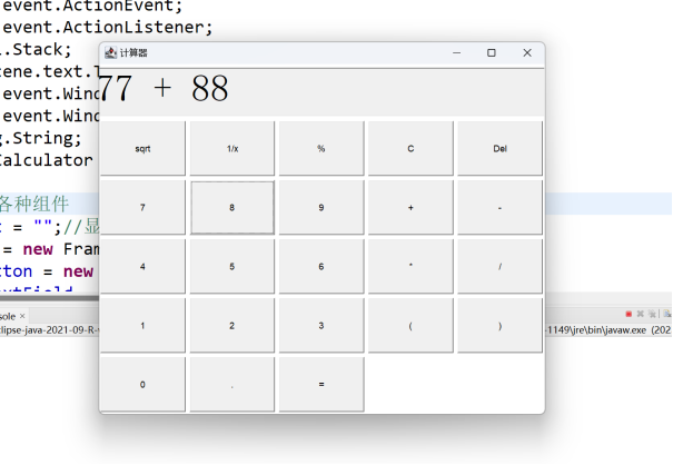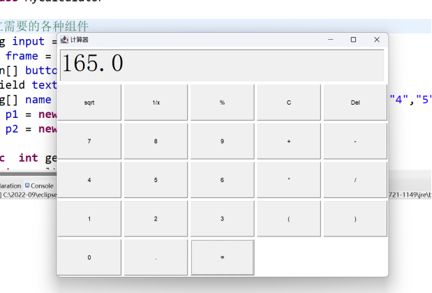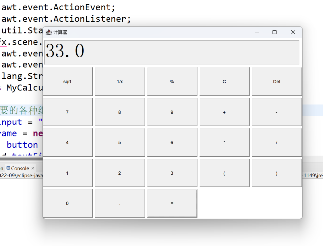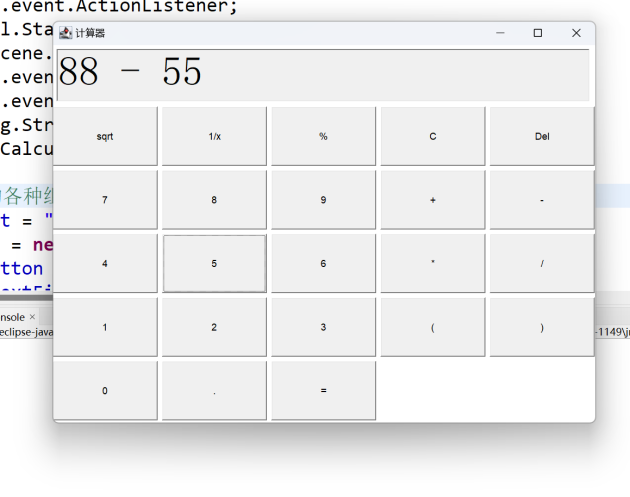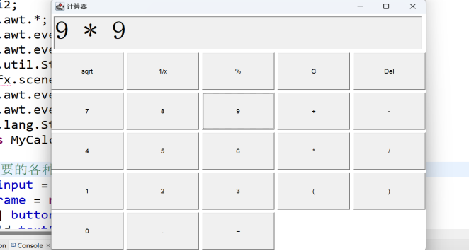 String[] name = {"sqrt","1/x","%","C","Del","7","8","9","+","-","4","5","6","*","/","1","2","3","(",")","0",".","="};//按钮的名称