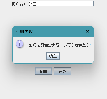 package jisuanqi11; import java.awt.event.ActionEvent; import java.awt.event.ActionListener; import java.io.BufferedReader; import java.io.File; import java.io.FileNotFoundException; import java.io.FileReader; import java.io.FileWriter; import java.io.IOException; import javax.swing.Box; import javax.swing.JButton; import javax.swing.JFrame; import javax.swing.JLabel; import javax.swing.JOptionPane; import javax.swing.JPanel; import javax.swing.JTextField; import javax.swing.WindowConstants; public class test { public char[] D= {'A','B','C','D','E','F','G','H','I','J','K','L','M','N','O','P','Q','R','S','T','U','V','W','X','Y','Z'}; public char[] d = {'a','b','c','d','e','f','g','h','i','j','k','l','m','n','o','p','q','r','s','t','u','v','w','x','y','z'}; public char[] s = {'0','1','2','3','4','5','6','7','8','9'}; public JTextField jtext0,jtext1; public String get_jtext0,get_jtext1; public JFrame jf; //目标文件 final String TARGET_FILE = "2000300420.txt"; File targetFile = new File(TARGET_FILE); public test() throws IOException { jf = new JFrame("罗少铭计算器注册登录页面"); jf.setSize(400, 400); jf.setDefaultCloseOperation(WindowConstants.EXIT_ON_CLOSE); JPanel jp0 = new JPanel(); JPanel jp1 = new JPanel(); JPanel jp2 = new JPanel(); jp0.add(new JLabel("用户名:")); jtext0 = new JTextField(20); jp0.add(jtext0); jp1.add(new JLabel("密 码:")); jtext1 = new JTextField(20); jp1.add(jtext1); JButton jb0 = new JButton("注册"); JButton jb1 = new JButton("登录"); jp2.add(jb0); jp2.add(jb1); if(targetFile.createNewFile()) { System.out.println("用户不存在,创建成功"); }else { System.out.println("用户存在"); } // 用户 注册操作 jb0.addActionListener(new ActionListener() { @Override public void actionPerformed(ActionEvent e) { String get_jtext0 = jtext0.getText(); String get_jtext1 = jtext1.getText(); int found0 =0,found1 =0,found2 =0; char[] a=get_jtext1.toCharArray(); for(int yy=0;yy<a.length;yy++) { for(int y=0;y<26;y++) { if(a[yy]==DD[y]) { found0=1; break; } } } for(int yy=0;yy<a.length;yy++) { for(int y=0;y<26;y++) { if(a[yy]==dd[y]) { found1=1; break; } } } for(int yy=0;yy<a.length;yy++) { for(int y=0;y<10;y++) { if(a[yy]==ss[y]) { found2=1; break; } } } System.out.println(found0+found1+found2); if(found0==0||found1==0||found2==0) { System.out.println("密码格式错误!"); //登录 消息对话框无返回, 仅做通知作用 JOptionPane.showMessageDialog( jf, "密码必须包含大写、小写字母和数字!", "注册失败", JOptionPane.INFORMATION_MESSAGE ); }else { try { //打开文件字符输出流 FileWriter writer = new FileWriter(targetFile,true); //写入文件 writer.write("\n"); writer.write(get_jtext0); System.out.println(get_jtext0); writer.write("\n"); writer.write(get_jtext1); writer.flush(); //关闭输出流 writer.close(); // 消息对话框无返回, 仅做通知作用 JOptionPane.showMessageDialog( jf, "注册成功!", "注册", JOptionPane.INFORMATION_MESSAGE ); // 消息对话框无返回, 仅做通知作用 JOptionPane.showMessageDialog( jf, "登录成功!", "登录", JOptionPane.INFORMATION_MESSAGE ); } catch (IOException e1) { // TODO Auto-generated catch block e1.printStackTrace(); } } } }); jb1.addActionListener(new ActionListener() { @Override public void actionPerformed(ActionEvent e) { String get_jtext0 = jtext0.getText(); String get_jtext1 = jtext1.getText(); // 读 FileReader in = null; try { in = new FileReader("2000300420.txt"); } catch (FileNotFoundException e2) { // TODO Auto-generated catch block e2.printStackTrace(); } BufferedReader bufIn = new BufferedReader(in); String line = null; String[] datas = new String[100]; // 读入结果 int i=0; int j=0; try { while ( (line = bufIn.readLine()) != null) { datas[i]=line; i++; } } catch (IOException e1) { // TODO Auto-generated catch block e1.printStackTrace(); } while(true) { if(datas[j].equals(get_jtext0)&&datas[j+1].equals(get_jtext1)) { // 消息对话框无返回, 仅做通知作用 calculator Calculator; JOptionPane.showMessageDialog(jf, "登录成功!", "登录", JOptionPane.INFORMATION_MESSAGE); new calculator(); break; } j++; if(datas[j]==null) { System.out.println("不存在该用户!"); // 清除框内输入字符 jtext0.setText(""); jtext1.setText(""); // 消息对话框无返回, 仅做通知作用 JOptionPane.showMessageDialog( jf, "不存在该用户!", "登录失败", JOptionPane.INFORMATION_MESSAGE ); break; } } // 关闭 输入流 try { bufIn.close(); in.close(); } catch (IOException e1) { // TODO Auto-generated catch block e1.printStackTrace(); } } }); // 创建一个垂直盒子容器, 把上面 3 个 JPanel 串起来作为内容面板添加到窗口 Box vBox = Box.createVerticalBox(); vBox.add(jp0); vBox.add(jp1); vBox.add(jp2); jf.setContentPane(vBox); // jf.pack(); jf.setLocationRelativeTo(null); jf.setVisible(true); } public static void main(String[] args) throws IOException { new test(); } }