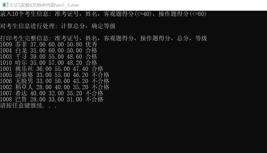 printf("\n打印考生完整信息: 准考证号,姓名,客观题得分,操作题得分,总分,等级\n");