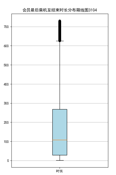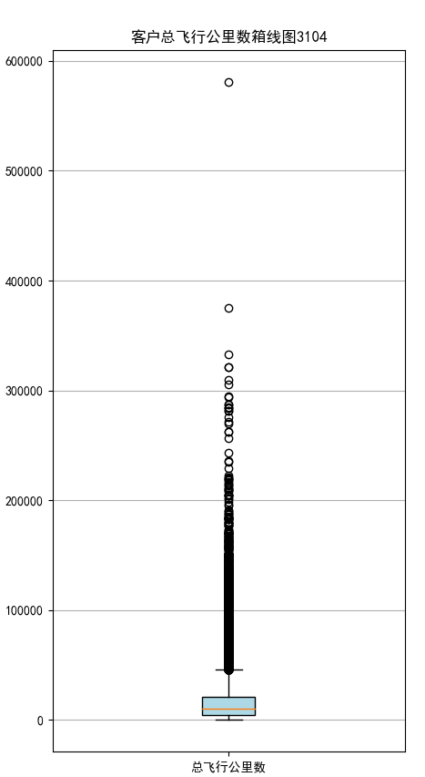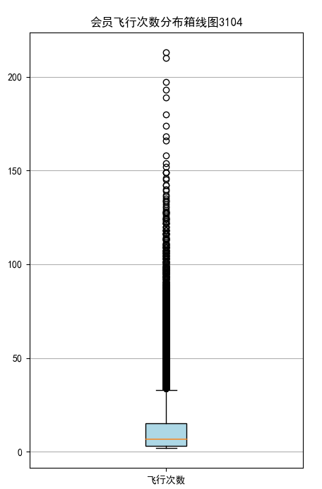 import pandas as pd import matplotlib.pyplot as plt # 乘机信息类别 datafile = r'C:\Users\Minori\Desktop\python实训\air_data.csv' data = pd.read_csv(datafile, encoding='utf-8') # 读取原始数据,指定UTF-8编码 lte = data['LAST_TO_END'] fc = data['FLIGHT_COUNT'] sks = data['SEG_KM_SUM'] plt.rcParams['font.sans-serif'] = 'SimHei' #设置中文显示 plt.rcParams['axes.unicode_minus'] = False fig = plt.figure(figsize = (5 ,8)) plt.boxplot(lte, patch_artist=True, labels = ['时长'], # 设置x轴标题 boxprops = {'facecolor':'lightblue'}) # 设置填充颜色 plt.title('会员最后乘机至结束时长分布箱线图3104') # 显示y坐标轴的底线 plt.grid(axis='y') plt.show() plt.close fig = plt.figure(figsize = (5 ,8)) plt.boxplot(fc, patch_artist=True, labels = ['飞行次数'], # 设置x轴标题 boxprops = {'facecolor':'lightblue'}) # 设置填充颜色 plt.title('会员飞行次数分布箱线图3104') # 显示y坐标轴的底线 plt.grid(axis='y') plt.show() plt.close fig = plt.figure(figsize = (5 ,10)) plt.boxplot(sks, patch_artist=True, labels = ['总飞行公里数'], # 设置x轴标题 boxprops = {'facecolor':'lightblue'}) # 设置填充颜色 plt.title('客户总飞行公里数箱线图3104') # 显示y坐标轴的底线 plt.grid(axis='y') plt.show() plt.close