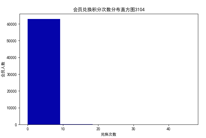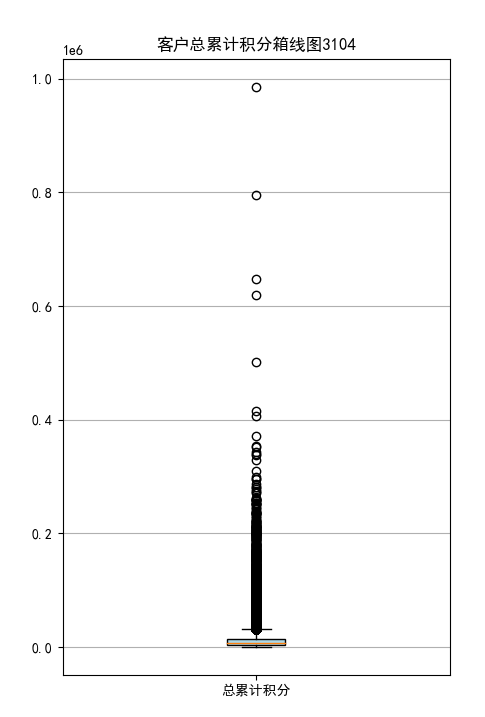 import pandas as pd import matplotlib.pyplot as plt # 提取会员积分兑换次数 datafile = r'C:\Users\Minori\Desktop\python实训\air_data.csv' data = pd.read_csv(datafile, encoding='utf-8') # 读取原始数据,指定UTF-8编码 ec = data['EXCHANGE_COUNT'] plt.rcParams['font.sans-serif'] = 'SimHei' #设置中文显示 plt.rcParams['axes.unicode_minus'] = False fig = plt.figure(figsize = (8 ,5)) # 设置画布大小 plt.hist(ec, bins=5, color='#0504aa') plt.xlabel('兑换次数') plt.ylabel('会员人数') plt.title('会员兑换积分次数分布直方图3104') # 提取会员总累计积分 ps = data['Points_Sum'] fig = plt.figure(figsize = (5 ,8)) plt.boxplot(ps, patch_artist=True, labels = ['总累计积分'], # 设置x轴标题 boxprops = {'facecolor':'lightblue'}) # 设置填充颜色 plt.title('客户总累计积分箱线图3104') # 显示y坐标轴的底线 plt.grid(axis='y') plt.show() plt.close