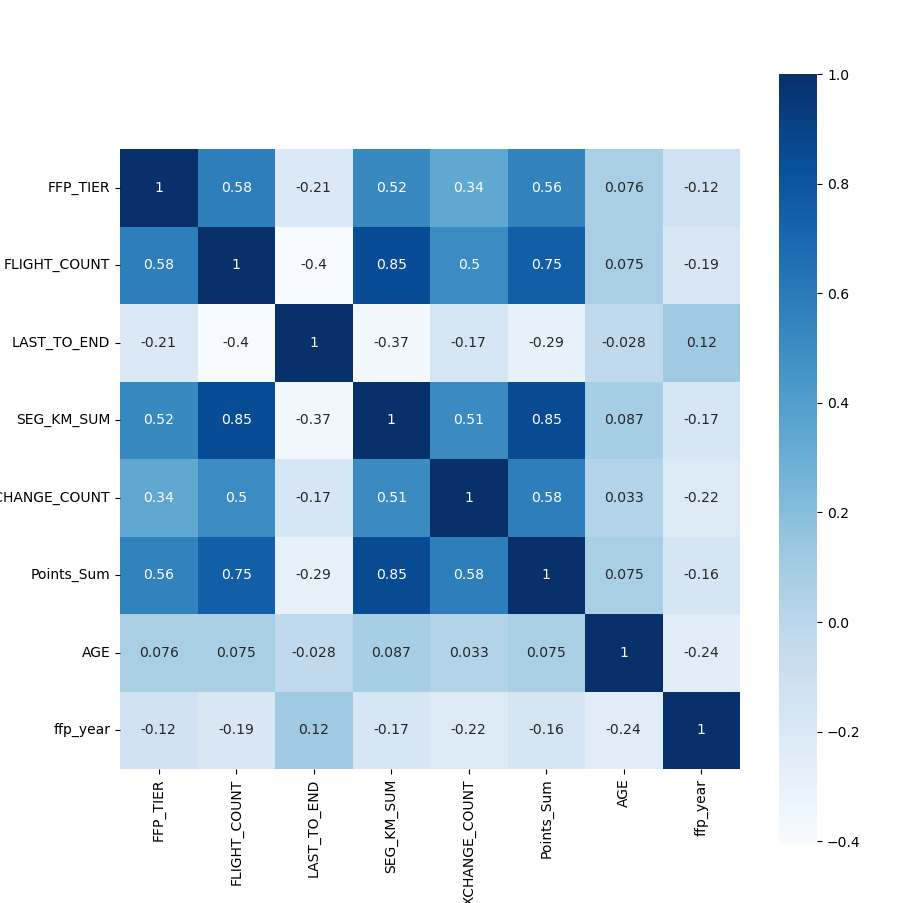 from datetime import datetime import matplotlib.pyplot as plt import pandas as pd datafile = r'C:\Users\Minori\Desktop\python实训\air_data.csv' data = pd.read_csv(datafile, encoding='utf-8') # 读取原始数据,指定UTF-8编码 ffp = data['FFP_DATE'].apply(lambda x:datetime.strptime(x,'%Y/%m/%d')) ffp_year = ffp.map(lambda x : x.year) data_corr = data[['FFP_TIER','FLIGHT_COUNT','LAST_TO_END','SEG_KM_SUM','EXCHANGE_COUNT','Points_Sum']] age1 = data['AGE'].fillna(0) data_corr['AGE'] = age1.astype('int64') data_corr['ffp_year'] = ffp_year # 计算相关性矩阵 dt_corr = data_corr.corr(method='pearson') print('相关性矩阵为:\n',dt_corr) # 绘制热力图 import seaborn as sns plt.subplots(figsize=(10,10)) sns.heatmap(dt_corr,annot=True,vmax=1,square=True,cmap='Blues') plt.show() plt.close