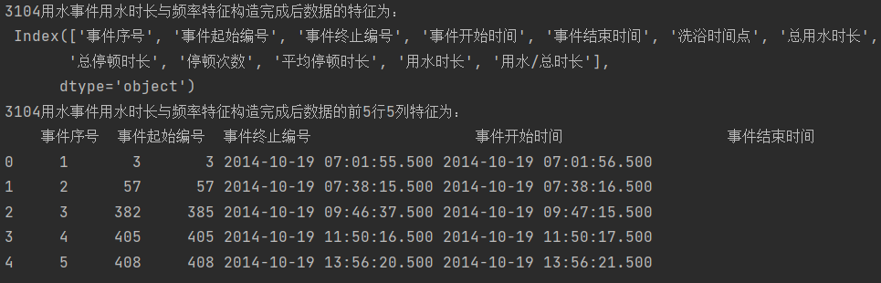 data = pd.read_excel('.\water_hearter.xlsx') # 读取热水器使用数据记录 sj = pd.read_csv('./sj.csv') # 读取用水事件记录 # 转换时间格式 data["发生时间"] = pd.to_datetime(data["发生时间"],format="%Y%m%d%H%M%S") # 构造特征:总用水时长 timeDel = pd.Timedelta("0.5 sec") sj["事件开始时间"] = data.iloc[sj["事件起始编号"]-1,0].values- timeDel sj["事件结束时间"] = data.iloc[sj["事件终止编号"]-1,0].values + timeDel sj['洗浴时间点'] = [i.hour for i in sj["事件开始时间"]] sj["总用水时长"] = np.int64(sj["事件结束时间"] - sj["事件开始时间"])/1000000000 + 1 # 构造用水停顿事件 # 构造特征“停顿开始时间”、“停顿结束时间” # 停顿开始时间指从有水流到无水流,停顿结束时间指从无水流到有水流 for i in range(len(data)-1): if (data.loc[i,"水流量"] != 0) & (data.loc[i + 1,"水流量"] == 0) : data.loc[i + 1,"停顿开始时间"] = data.loc[i +1, "发生时间"] - timeDel if (data.loc[i,"水流量"] == 0) & (data.loc[i + 1,"水流量"] != 0) : data.loc[i,"停顿结束时间"] = data.loc[i , "发生时间"] + timeDel # 提取停顿开始时间与结束时间所对应行号,放在数据框Stop中 indStopStart = data.index[data["停顿开始时间"].notnull()]+1 indStopEnd = data.index[data["停顿结束时间"].notnull()]+1 Stop = pd.DataFrame(data={"停顿开始编号":indStopStart[:-1], "停顿结束编号":indStopEnd[1:]}) # 计算停顿时长,并放在数据框stop中,停顿时长=停顿结束时间-停顿结束时间 Stop["停顿时长"] = np.int64(data.loc[indStopEnd[1:]-1,"停顿结束时间"].values- data.loc[indStopStart[:-1]-1,"停顿开始时间"].values)/1000000000 # 将每次停顿与事件匹配,停顿的开始时间要大于事件的开始时间, # 且停顿的结束时间要小于事件的结束时间 for i in range(len(sj)): Stop.loc[(Stop["停顿开始编号"] > sj.loc[i,"事件起始编号"]) & (Stop["停顿结束编号"] < sj.loc[i,"事件终止编号"]),"停顿归属事件"]=i+1 # 删除停顿次数为0的事件 Stop = Stop[Stop["停顿归属事件"].notnull()] # 构造特征 用水事件停顿总时长、停顿次数、停顿平均时长、 # 用水时长,用水/总时长 stopAgg = Stop.groupby("停顿归属事件").agg({"停顿时长":sum,"停顿开始编号":len}) sj.loc[stopAgg.index - 1,"总停顿时长"] = stopAgg.loc[:,"停顿时长"].values sj.loc[stopAgg.index-1,"停顿次数"] = stopAgg.loc[:,"停顿开始编号"].values sj.fillna(0,inplace=True) # 对缺失值用0插补 stopNo0 = sj["停顿次数"] != 0 # 判断用水事件是否存在停顿 sj.loc[stopNo0,"平均停顿时长"] = sj.loc[stopNo0,"总停顿时长"]/sj.loc[stopNo0,"停顿次数"] sj.fillna(0,inplace=True) # 对缺失值用0插补 sj["用水时长"] = sj["总用水时长"] - sj["总停顿时长"] # 定义特征用水时长 sj["用水/总时长"] = sj["用水时长"] / sj["总用水时长"] # 定义特征 用水/总时长 print('3104水事件用水时长与频率特征构造完成后数据的特征为:\n',sj.columns) print('3104用水事件用水时长与频率特征构造完成后数据的前5行5列特征为:\n', sj.iloc[:5,:5])