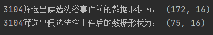 sj_bool = (sj['用水时长'] >100) & (sj['总用水时长'] > 120) & (sj['总用水量'] > 5) sj_final = sj.loc[sj_bool,:] sj_final.to_excel('./sj_final.xlsx',index=False) print('3104筛选出候选洗浴事件前的数据形状为:',sj.shape) print('3104筛选出候选洗浴事件后的数据形状为:',sj_final.shape)