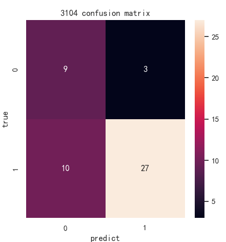 import seaborn as sns from sklearn.metrics import accuracy_score, confusion_matrix import matplotlib.pyplot as plt C2=confusion_matrix(y_test, pre_y) # 注意到Scikit-Learn使用predict方法直接给出预测结果。 print(C2) #打印出来看看 # 2.2 根据混淆矩阵画热力图 sns.set() f,ax=plt.subplots(figsize=(5, 5)) sns.heatmap(C2, annot=True, fmt=".3g",ax=ax) # 画热力图,注意:默认fmt=".2g",此时图中的数据"144"会显示成"1.4e+02" ax.set_title('3104 confusion matrix') # 标题 ax.set_xlabel('predict') # x轴 ax.set_ylabel('true') # y轴