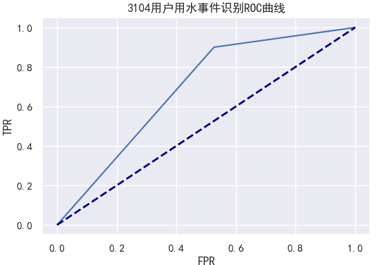 from sklearn.metrics import classification_report from sklearn.metrics import roc_curve import joblib import matplotlib.pyplot as plt bpnn = joblib.load('./water_heater_nnet.m') # 加载模型 y_pred = bpnn.predict(x_stdtest) # 返回预测结果 print('神经网络预测结果评价报告:\n',classification_report(y_test,y_pred)) # 绘制roc曲线图 plt.rcParams['font.sans-serif'] = 'SimHei' # 显示中文 plt.rcParams['axes.unicode_minus'] = False # 显示负号 fpr, tpr, thresholds = roc_curve(y_pred,y_test) # 求出TPR和FPR plt.figure(figsize=(6,4)) # 创建画布 plt.plot(fpr,tpr) # 绘制曲线 plt.plot([0, 1], [0, 1], color='navy', lw=2, linestyle='--') # 辅助对角线 plt.title('3104用户用水事件识别ROC曲线') # 标题 plt.xlabel('FPR') # x轴标签 plt.ylabel('TPR') # y轴标签 plt.savefig('./用户用水事件识别ROC曲线.png') # 保存图片 plt.show() # 显示图形