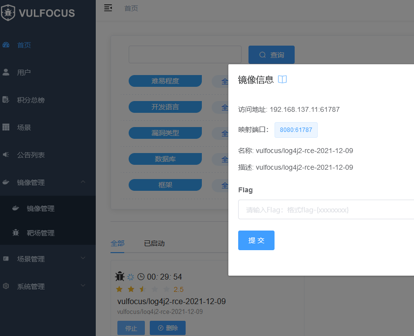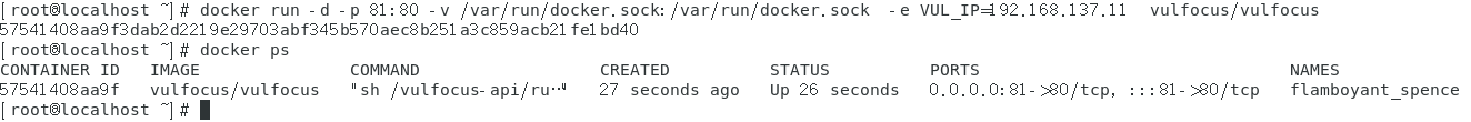 docker run -d -p 81:80 -v /var/run/docker.sock:/var/run/docker.sock -e VUL_IP=192.168.137.11 vulfocus/vulfocus