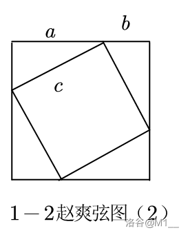 2.同理,构建四个全等直角三角形,使得三角形的斜边为 \(c\) , 两条直角边分别为 \(a\),\(b\) 。以直角边 \(a\),\(b\) 的长度为边长,构建一个正方形。此时内部的小正方形边长为 \(c\) 。如图 \(1-2\) :