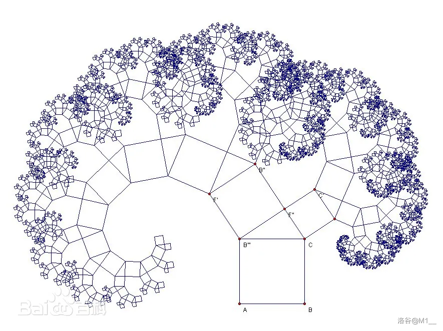 - 分别以 \(S1\) , \(S2\) 的边长为直角三角形的斜边,构造等腰三角形。再以构造出的等腰三角形的两条直角边为边长,构建正方形。以此类推。重复若干次后,即可得到毕达哥拉斯树(勾股树)。