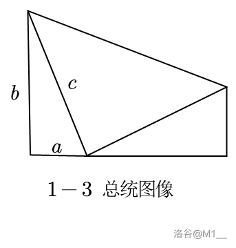 - 作法:构建两个全等三角形,使得三角形的斜边为 \(c\) , 两条直角边分别为 \(a\),\(b\) 。以斜边 \(c\) 的长度为边长,构建一个等腰直角三角形,拼接三个图形,使其成为一个梯形,如图 \(1-3\) :