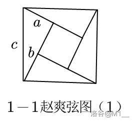 1.构建四个全等直角三角形,使得三角形的斜边为 \(c\) , 两条直角边分别为 \(a\),\(b\) 。以斜边 \(c\) 的长度为边长,构建一个正方形。此时内部的小正方形边长为 \(a-b\) 。如图 \(1-1\) :