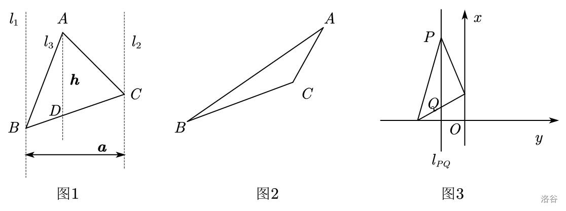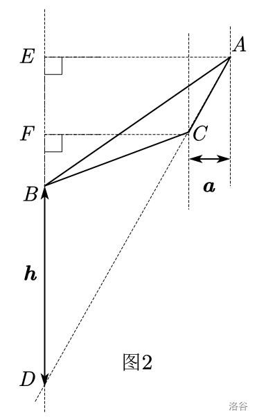 但是上图显然看不出什么,我们可以用它们的公共边上两个定点的投影长度叫做水平宽。两个三角形的第三点分别交公共边所在的直线与一点。我们将第三点和交点的距离之和称为铅垂高。如下图: