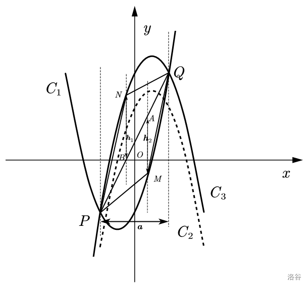 - 若点 \(M,N\) 分别为抛物线 \(C_1\) 和 \(C_3\) 上 \(P,Q\) 之间的点(点 \(M,N\) 均不与点 \(P,Q\) 重合),直接写出四边形 \(PMQN\) 面积的最大值。