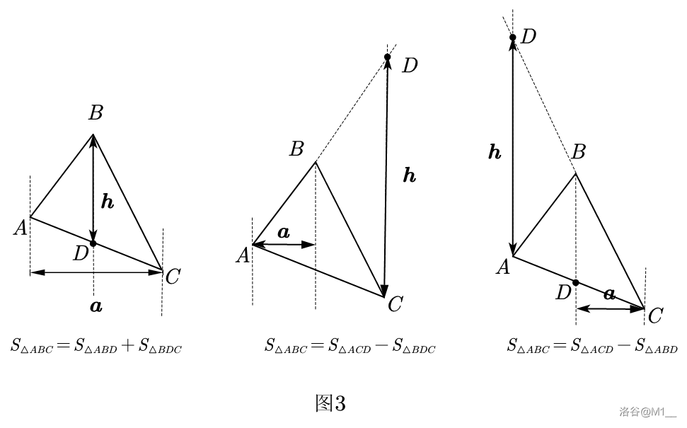 一个三角形有三对水平宽和铅垂高。如图 \(3\)。任意一组水平宽和铅垂高都满足 \(S_{\triangle ABC}=\frac{1}{2}\boldsymbol{a} \boldsymbol{h}\)。