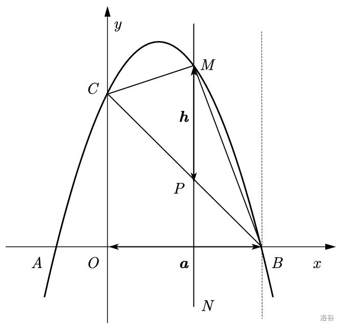 又因为 \(OB=\boldsymbol{a}\),所以当 \(S_{\triangle BCM}\) 最大时,\(x_P=-\frac{b}{2a}=\frac{3}{2}\)。将其代入 \(l_{BC}:y=-x+3\) 中,可得 \(P(\frac{3}{2},\frac{3}{2})\)。