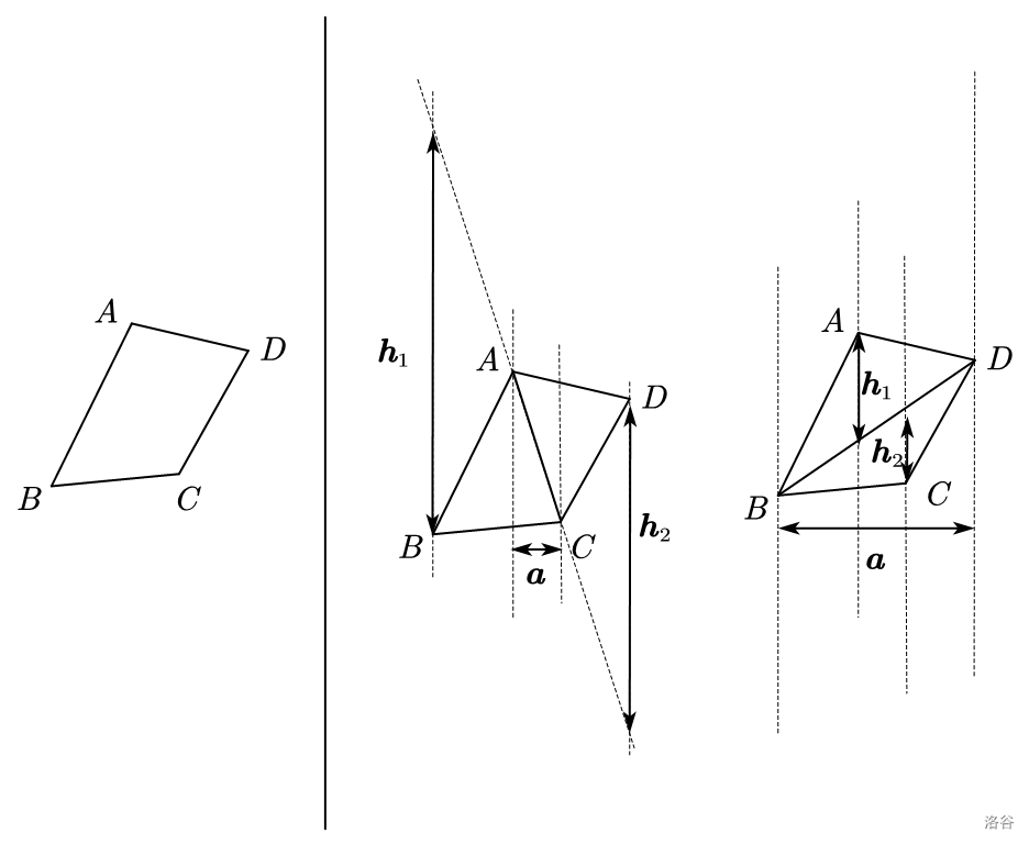 - 分别过四边形另外两个顶作水平宽的垂线,分别交该对角线所在的直线为一点。这两组点的距离分别记作 \(\boldsymbol{h_1,h_2}\)。这两组点的距离之和是该四边形的铅垂高,记作 \(\boldsymbol{h_1+h_2}\)。