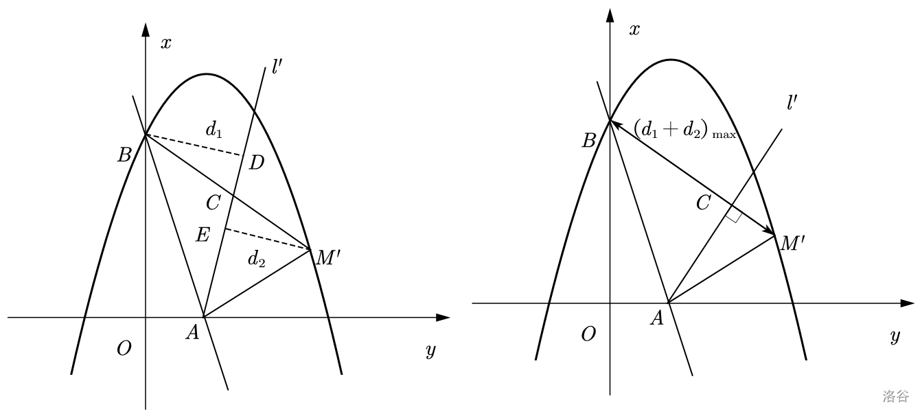 - 将直线 \(l\) 绕点 \(A\) 按顺时针方向旋转得到直线 \(l'\),当直线 \(l'\) 与直线 \(AM'\) 重合时停止旋转,在旋转过程中,直线 \(l'\) 与线段 \(BM'\) 交于点 \(C\),设点 \(B\)、\(M'\) 到直线 \(l'\) 的距离分别为 \(d_1\)、\(d_2\),当 \(d_1+d_2\) 最大时,求直线 \(l'\) 旋转的角度(即 \(\angle BAC\) 的的度数)。