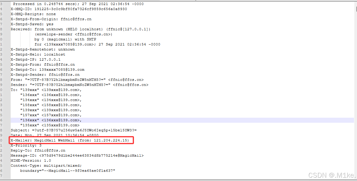 使用文本编辑器打开钓鱼邮件内容,查看内容分析可以发现该邮件来自 121.204.224.15