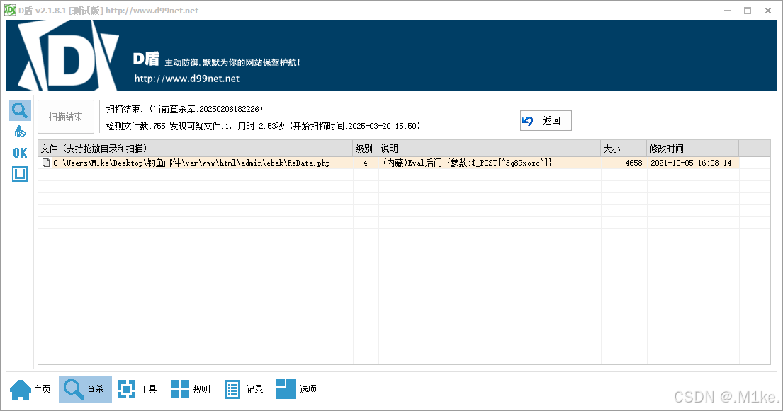 这里说黑客创建了webshell,在本地使用D盾或者其他的杀软排查一下,就可以发现webshell