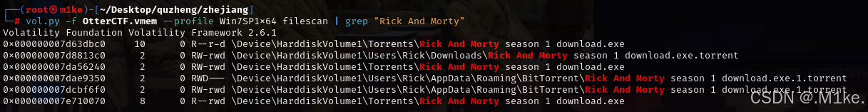 恶意软件进入电脑的方式无非就是通过U盘或者网页下载,使用 filescan 扫描一下所有和Rick And Morty 相关的文件