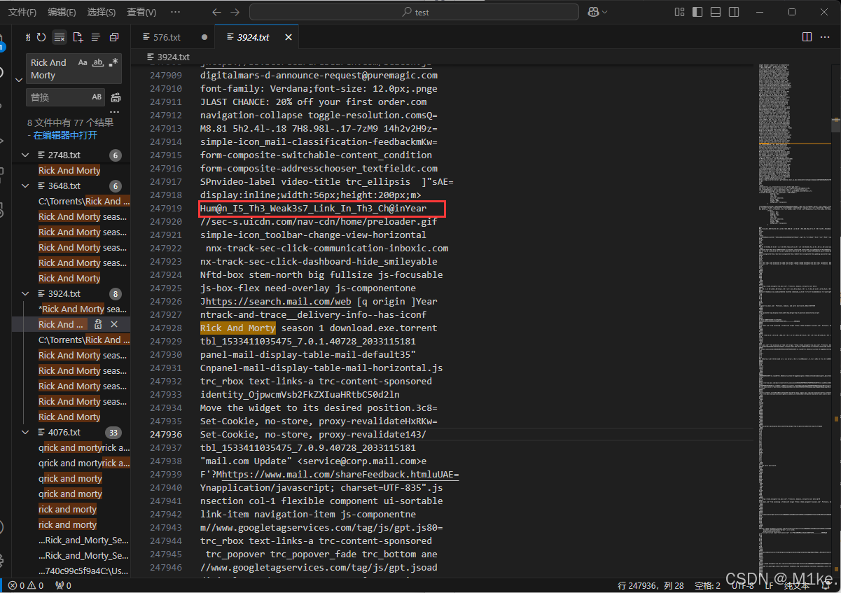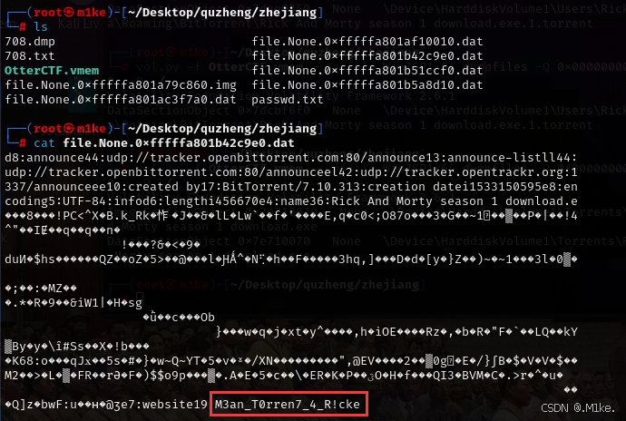 再使用 strings 将所下载下来的进程文件进行转储,在文件中搜索关键字 " Rick And Morty ",最后在一个 BT 种子前面找到了关键信息